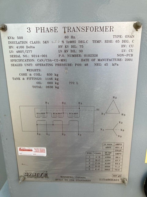 CARTE 3 PHASE TRANSFORMER, 500KVA, VOLTAGE 4160 HV ,LV 480Y/277