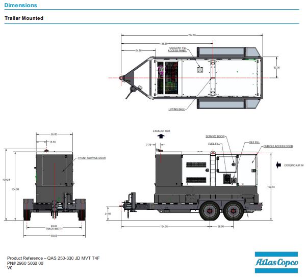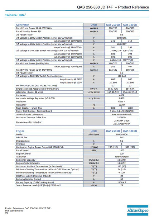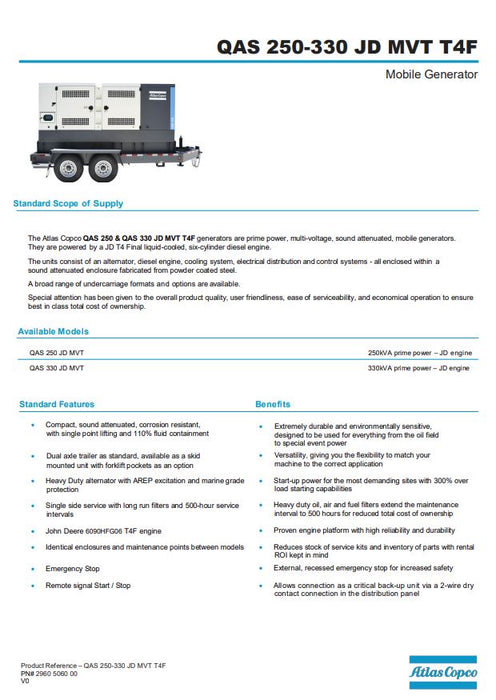 The Atlas Copco QAS 250 MD T4F generators are prime power, multi-voltage, sound attenuated, mobile generators. They are powered by a T4 Final liquid-cooled, six-cylinder diesel engine.